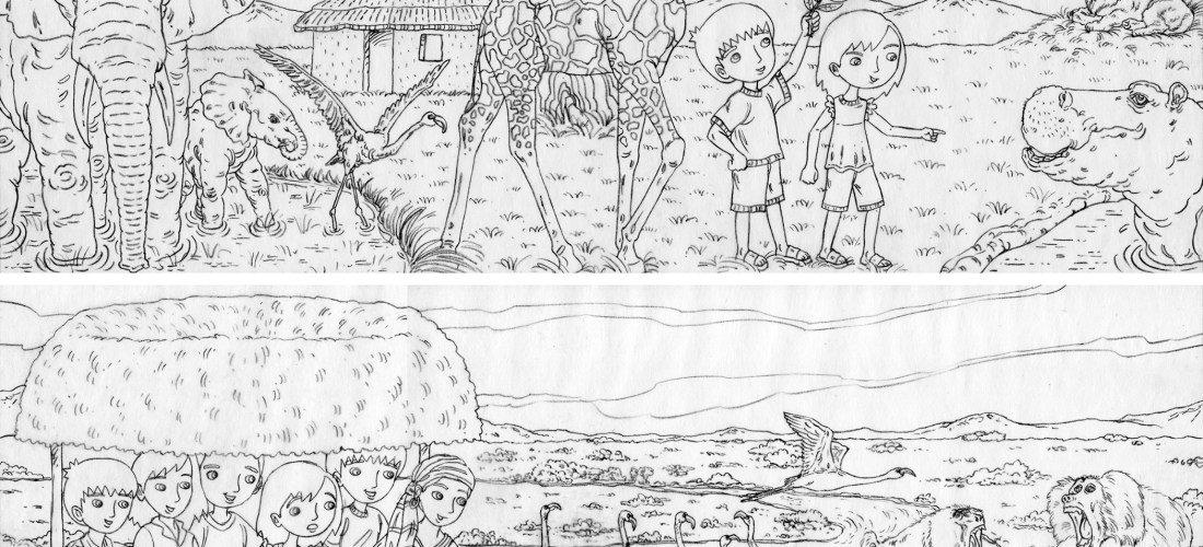 I worked on a picture book set in Kenya for the same publisher I did the Galapagos book for. The project fell through, but here are some of the sketches. This was fun—so many animals!
