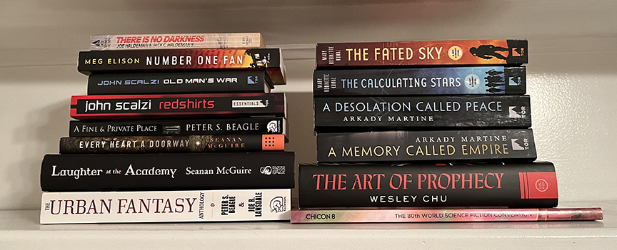 • My son and I both got a bunch of books signed. I’m more of a reader than a collector, but the chance to share a couple of words and get books autographed by some of my favorite authors was too hard to resist. Especially happy to meet John Scalzi, Seanan McGuire, Peter S. Beagle (holy shit), and Joe Haldeman (holy shit again). We also got autographs from Arkady Martine, Mary Robinette Kowal, Wesley Chu, and Meg Elison. They were all friendly, kind, and giving of their time.