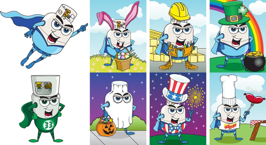 A local propane company asked me to create a logo character for them, and this was the result. The little scenes were for a series of holiday posters. Supertankman has ended up as a 3D printed model, a plush toy, embroidered on jackets and hats—a surprising number of things.
