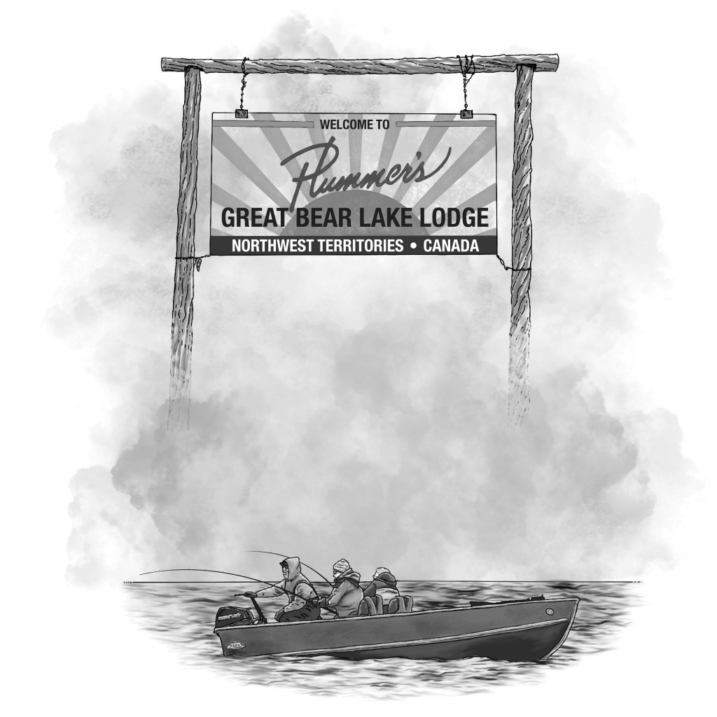 My son Eric and I recently spent a week fishing at Plummer’s Great Bear Lake Lodge above the Arctic Circle. I promised Chuk, the lodge manager, that I would write a story for their newsletter, and do an accompanying illustration. Here’s what I came up with, an image of the lodge sign, along with Eric and I and our guide in our boat with a double hook-up, based on a photo a friend in another boat took. I did this on my iPad using Procreate, and I’m very happy with how it came out.