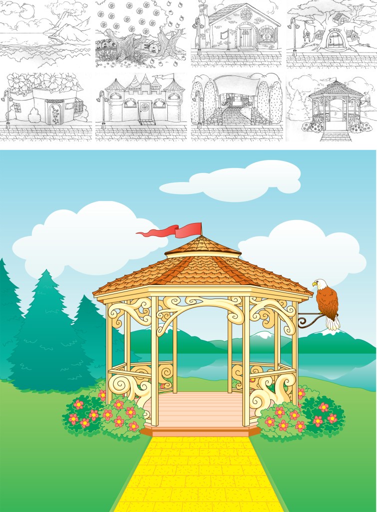 Many years back I worked with a a start-up kids TV show called The Magic Easel. Part of my job included designing the show’s opening sequence, which was a tour of the small town where the show was set. Just about all the art has disappeared into the great unknown, but here are some of the town sketches, plus the one piece of finished art I still have.
