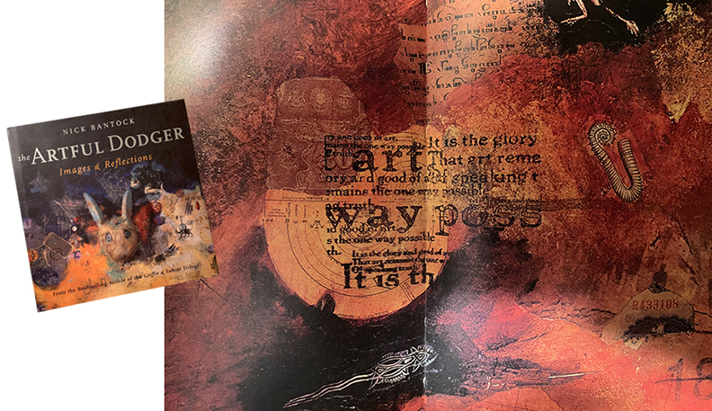 So I’m in Ginny’s stamp store one day, and she hands me Bantock’s lavish, oversized hardcover art book, Artful Dodger, and tells me to look at the collage in the center spread. Lo and behold, there, in the center of the collage, is one of my stamps. Probably the proudest moment of my stamp design career. Check it out below. That’s my artwork, the stamp featuring a quote about art, there in the middle.