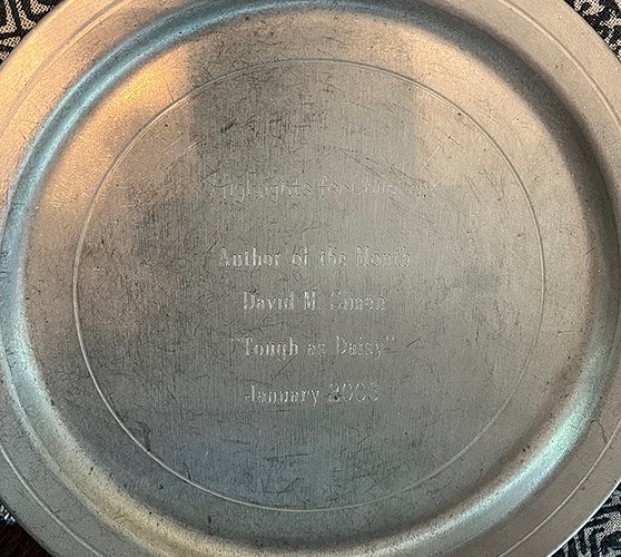 It’s a little hard to make out, but it reads: Highlights for Children Author of the Month David M. Simon “Tough as Daisy” January 2005